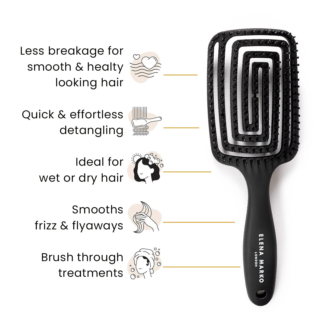 Elevate your daily hair care routine with the Elena Marko Curved Vent Detangling Hair Brush. Expertly designed by Elena Marko, a London-based stylist with over 20 years of salon floor experience, this brush combines professional-grade performance with a sleek, ergonomic finish.